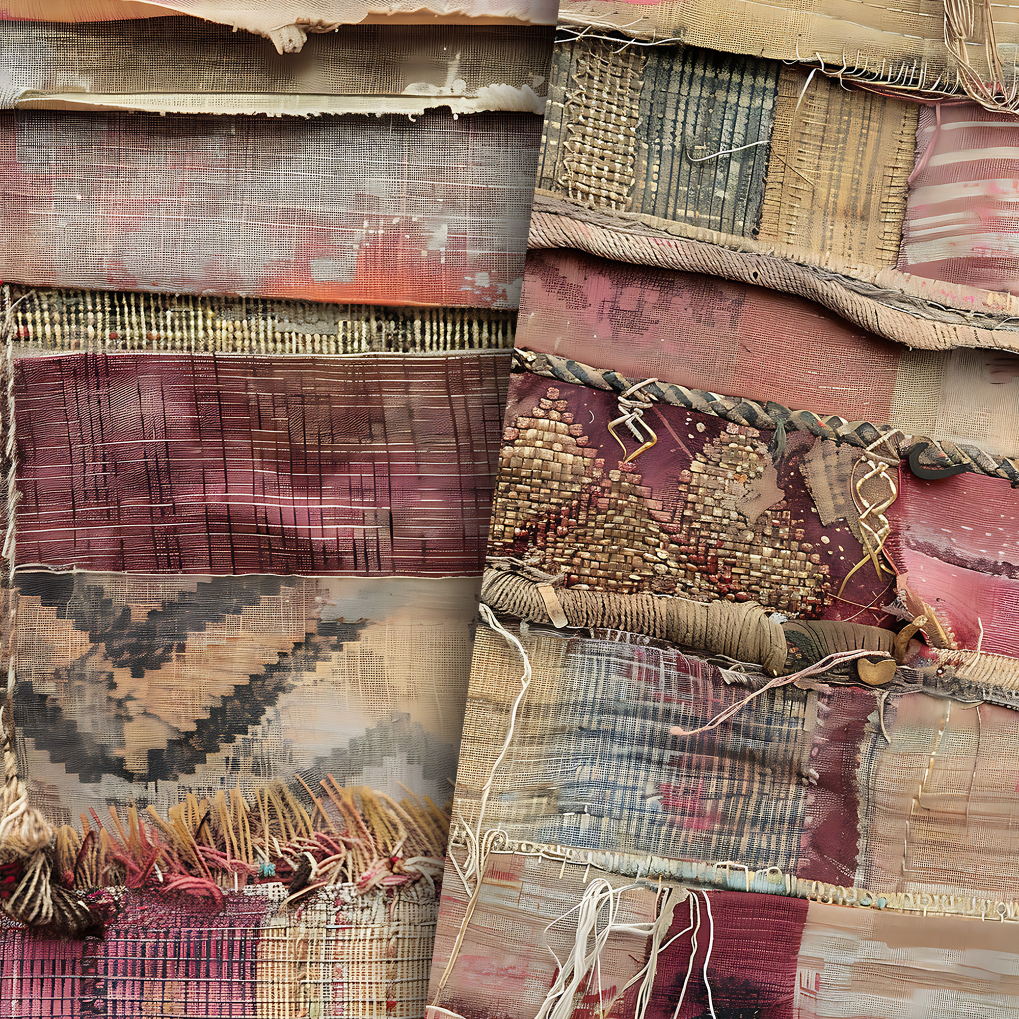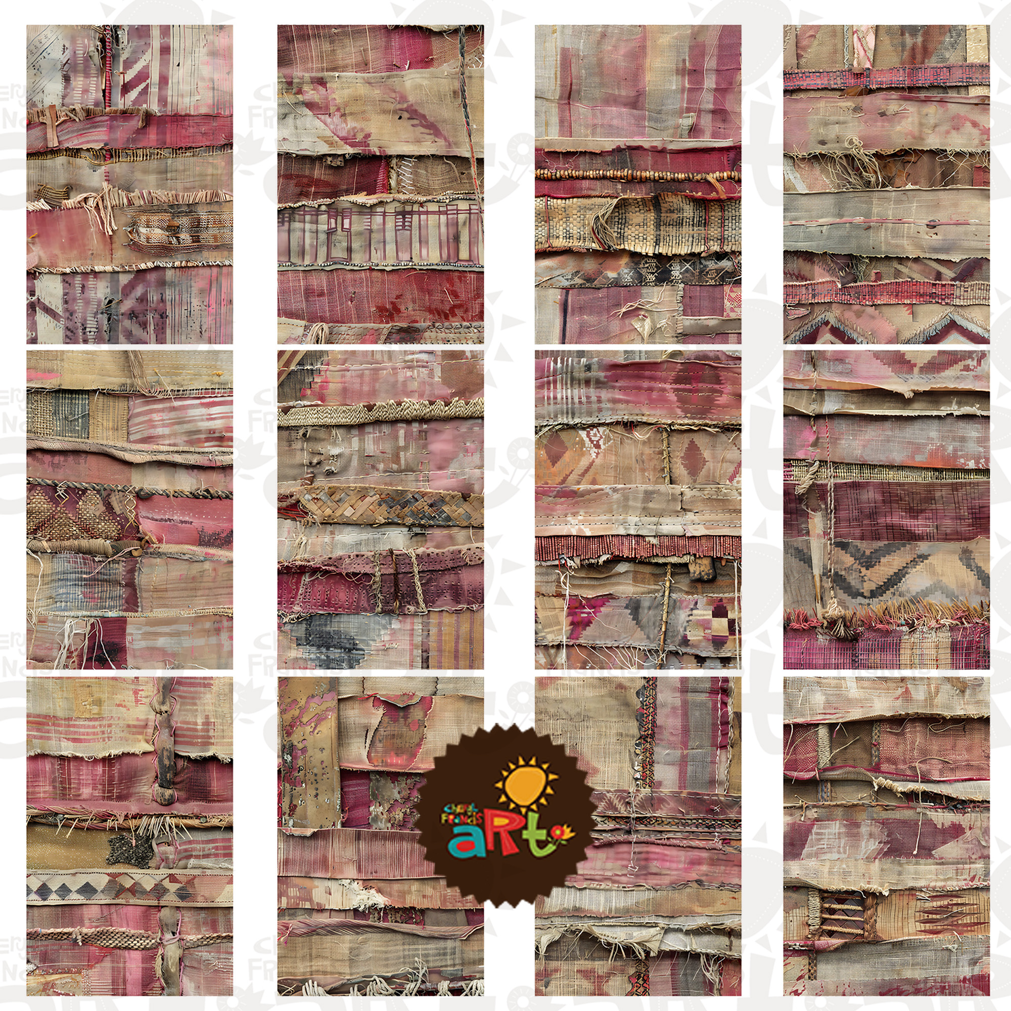 12 pc Grungy Textile Rose and Beige Mixed Media Printable Junk Journal Half Papers for Book Making, Crafting, Digital Design, Cards, Decoupage and Scrapbooking, Papercraft Digital Kit