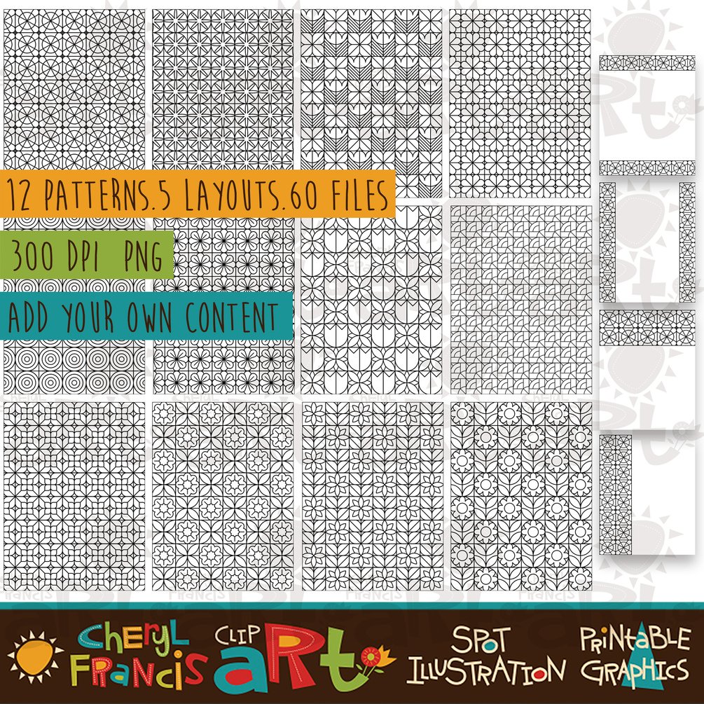 12 patterns in 5 page layouts. 60 files to decorate your KDP book pages. Full page plus headers and borders. Placement allows plenty of room to add your own content. Make your templates unique. Great way to give your book a more professional, put together look that is super easy to do. Your customers will appreciate the ability to color their own pages. Page content shown is only displayed here as an example. You are purchasing individual black and white pngs with transparent backgrounds.